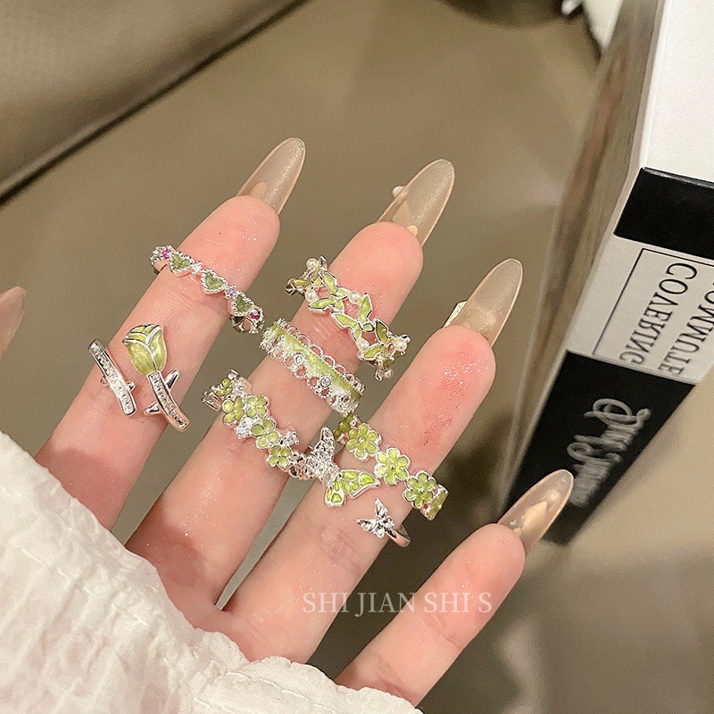 Spring Forest Style Matcha Butterfly Ring for Women, Trendy Personality, Brightening Index Finger Ring, Elegant Stacked Flower Ring