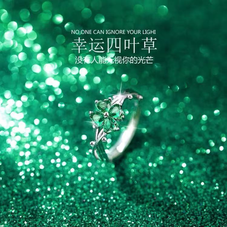 Hongjin Green Four-Leaf Clover Ring for Girls, Accessible Luxury, High-End, Niche Trendy, Adjustable, Gift for Girlfriend