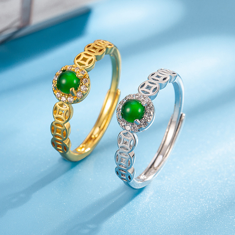 Money Rolling Imitation Chalcedony Ring Light Luxury Copper Coin Egg Noodles Women's Vintage Exquisite Rich Emerald National Fashion Ring