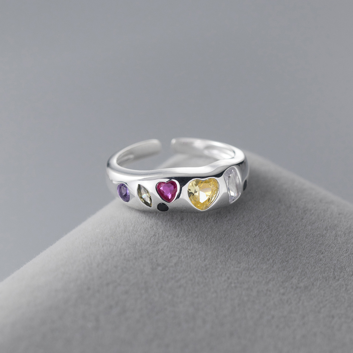 02216 Japanese and Korean New Ins Style Colorful Diamond Asymmetrical Heart Ring Multi-Color Stone Girl Heart Student Female Index Finger Ring