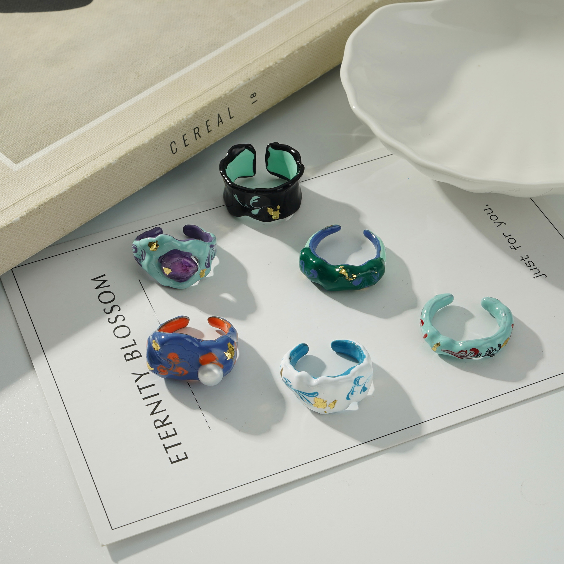 Enamel Ring Women's Pearl Gold Foil Open Ring Niche Design Advanced Sense European and American Fashion Personality Oil Drop Finger Ring