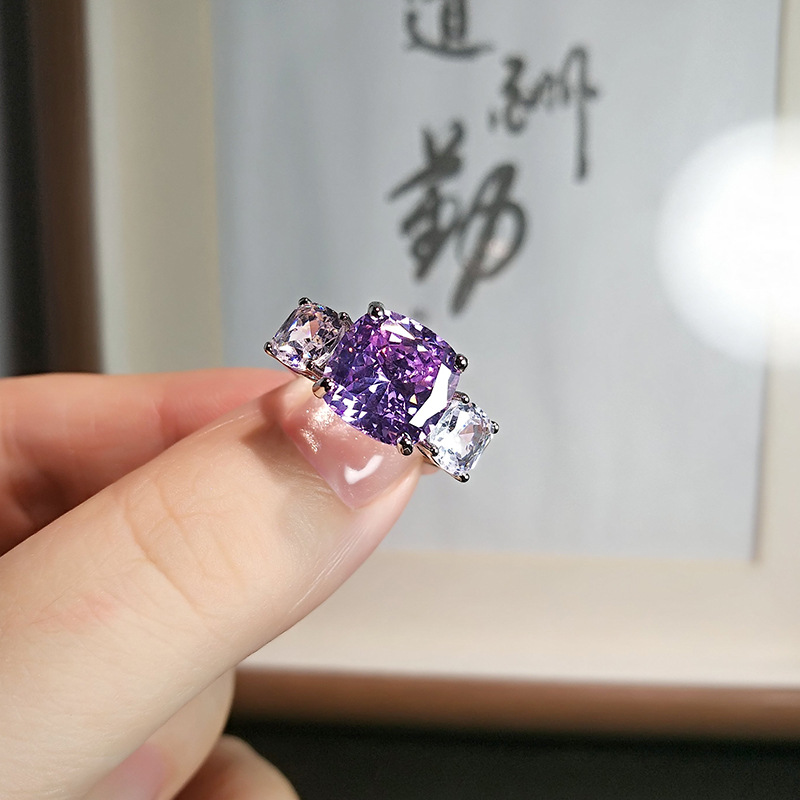 Live Broadcast Hot Selling Ice Flower Cut Square Pink Stone Ring for Women, Light Luxury and High-End Purple Zircon Super Flash Live Diamond Ring