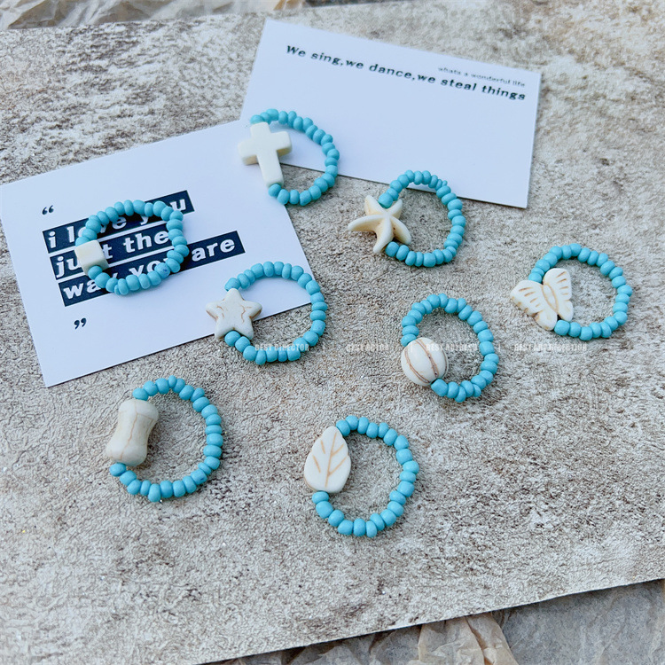 Summer Beach style geometric cross beaded ins style all-match rice beads elastic ring hot girl girl sweet cool ring