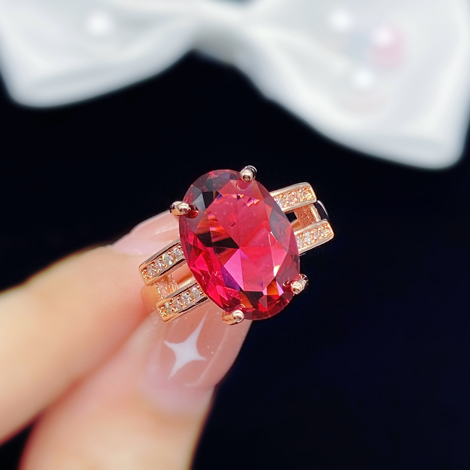 New Elegant Fashion Double Row Flash Diamond Oval Simulation Red Tourmaline Color Treasure Open Ring for Women