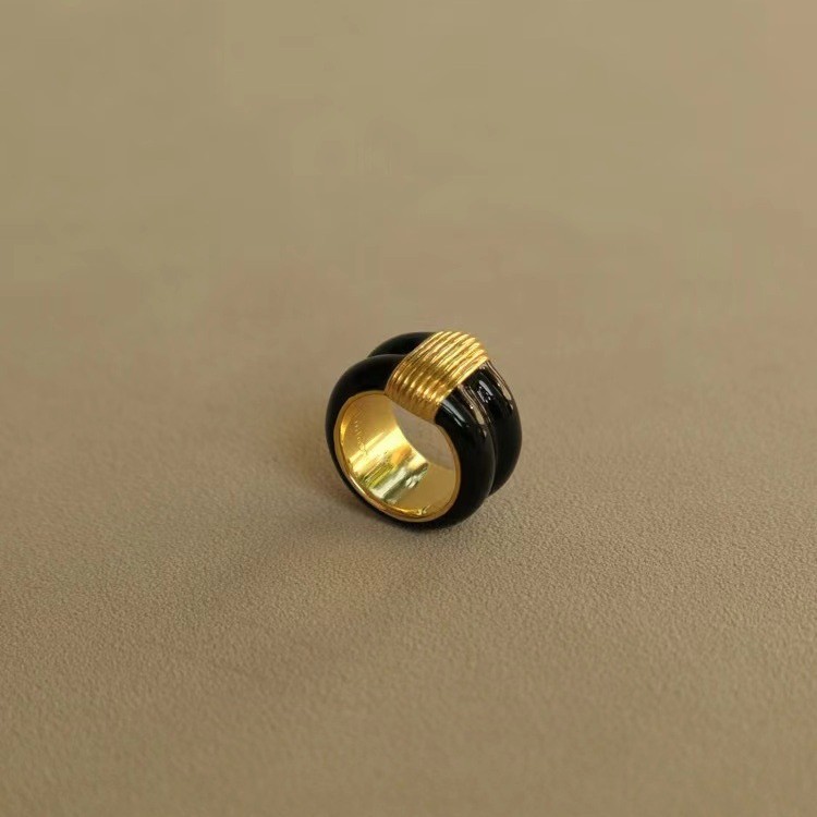 French simple black oil dripping ridge pattern ring female plated 18K gold black gold enamel striped index finger ring ins style ring
