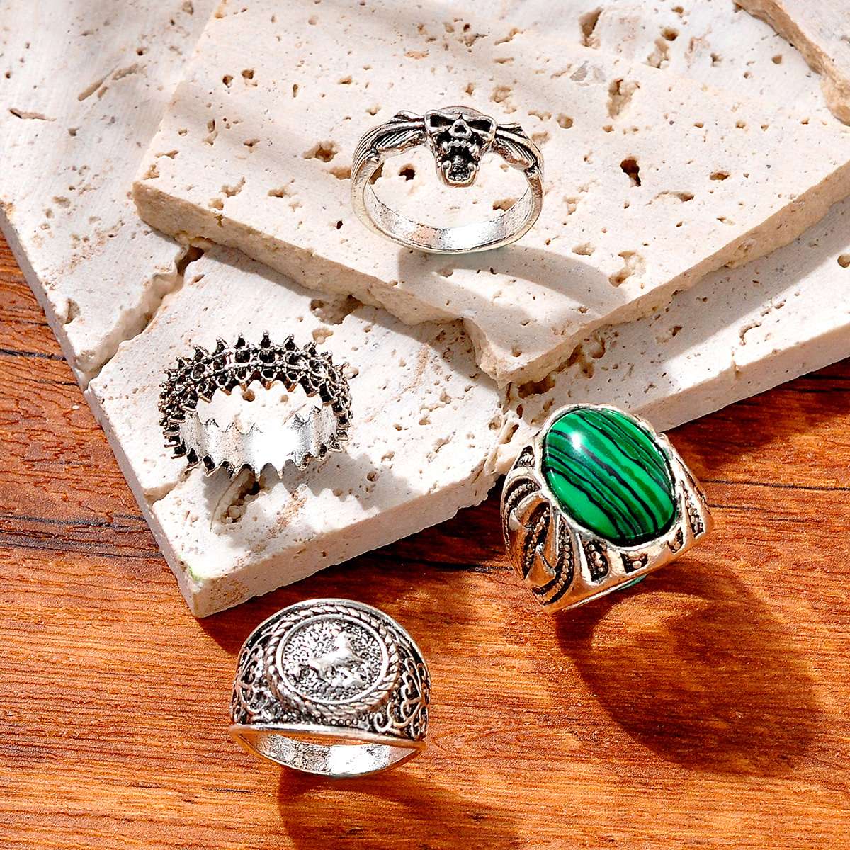 Vintage Malachite Horse Totem Flame Skull Personalized Fashion Hip Hop Trendy Ring Set