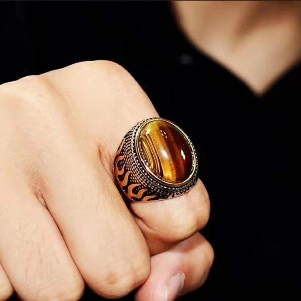 Dragon and TEMU new ring European and American style flame domineering tiger eye stone men's and women's ring retro men's ring
