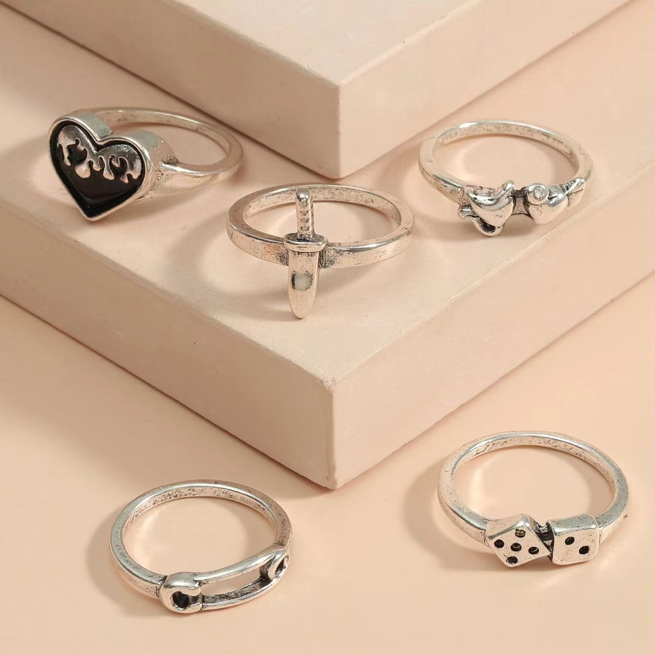 European and American Creative Ring Set Ins Same Style Alloy Love Pclip Ring 5 Piece Set Personalized Retro Jewelry
