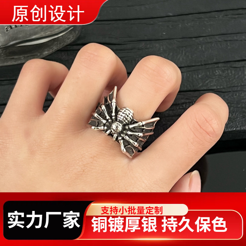 Cool Sa Copper Plated 925 Silver Personality Trendy Spider Open Ring Dark Creative Accessories Trendy Rock Finger Ring