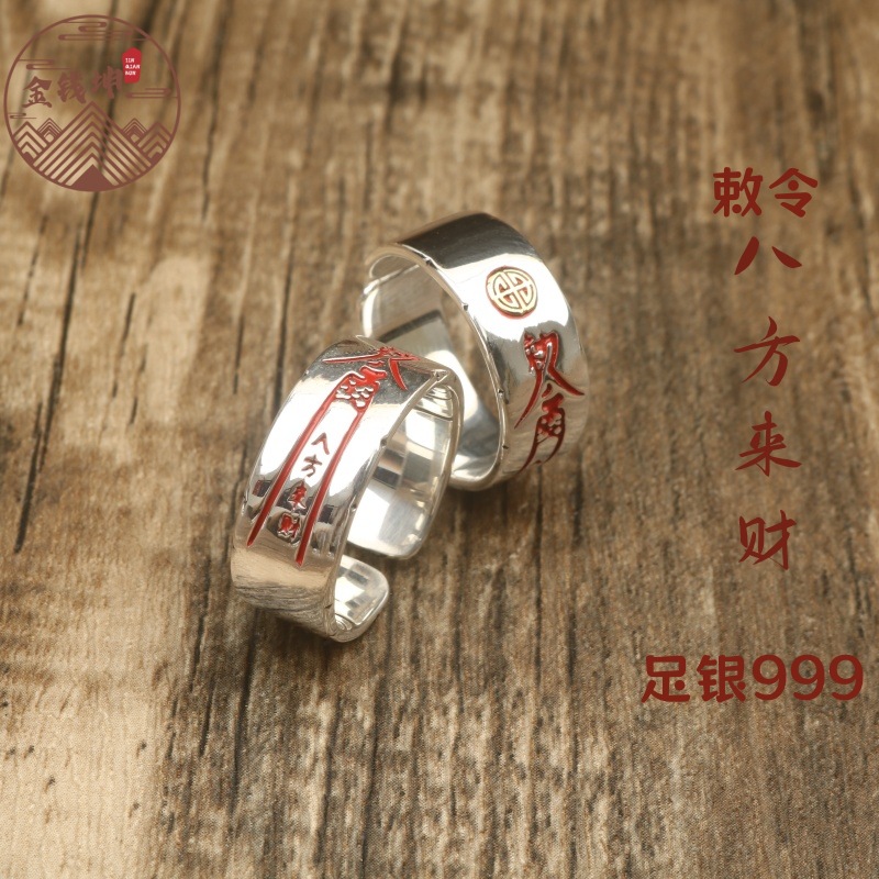 Sterling Silver 999 [Wealth from All Directions] New Adjustable Men's Cinnabar Dao Style Wide Open Ring Direct from Factory