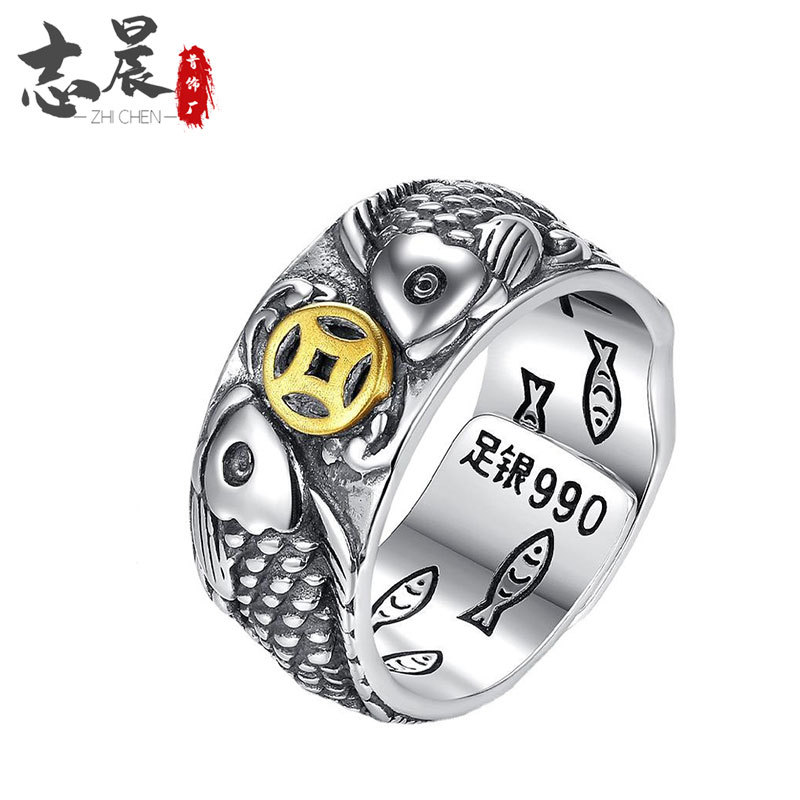 Double Golden Dragon Fish Copper Ring Men's National Fashion Personality Retro Ethnic Style Craft Open Ring Adjustable Jewelry