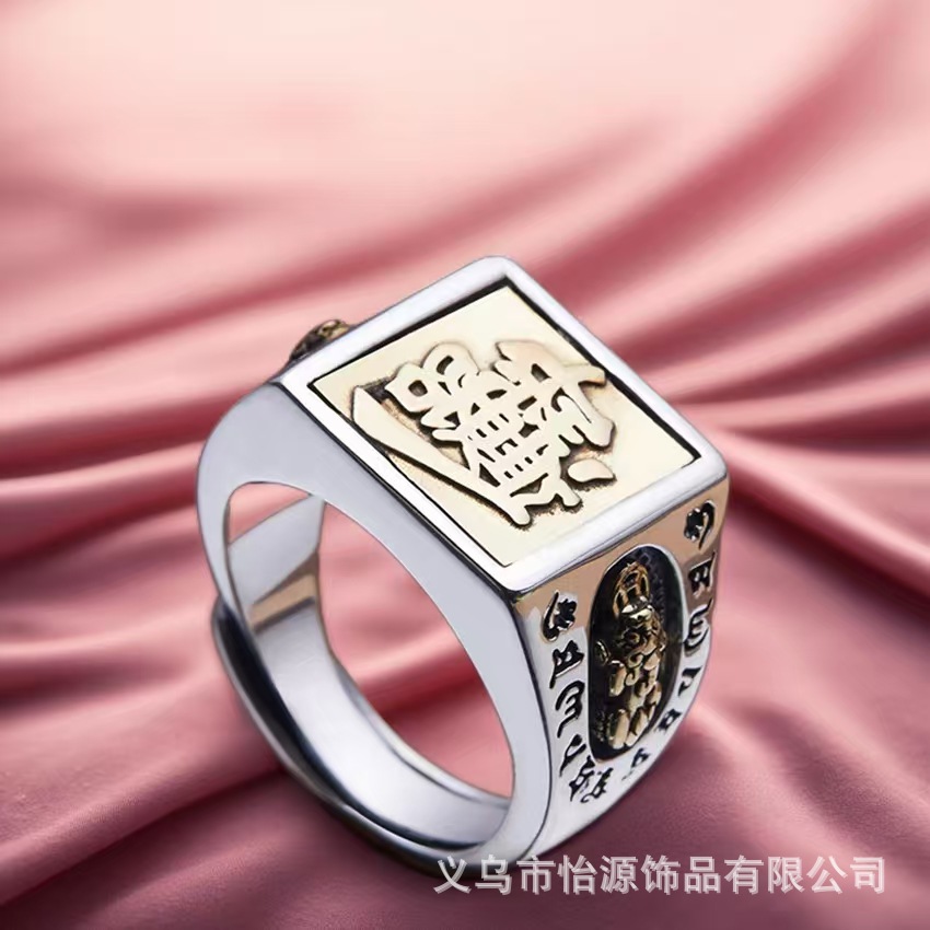 Men's Bold and Prosperous Fashion Large Ring Wholesale, Vietnamese Sand Gold Pure Copper Gold-Plated Prosperity Dragon Character Adjustable Ring