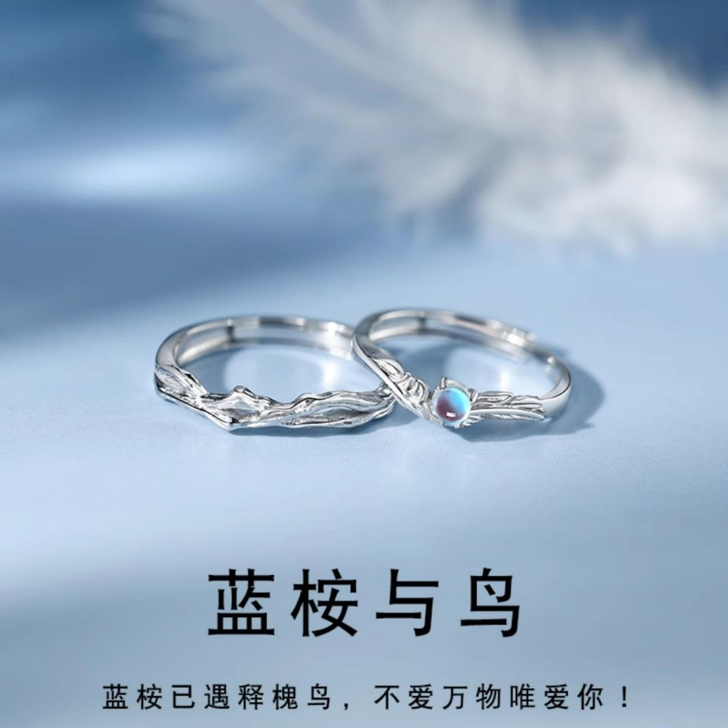 Eucalyptus and Bird S925 Sterling Silver Moonstone Couple Ring a Pair of Niche Design Open Rings for Men and Women