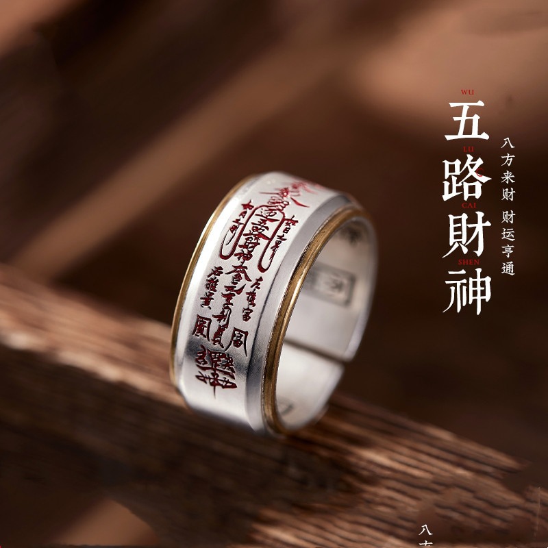 Handmade Original "Five Road God of Wealth" Fortune Ring Men's Sterling Silver Cinnabar Taoist Safety Transfer Wide Ring