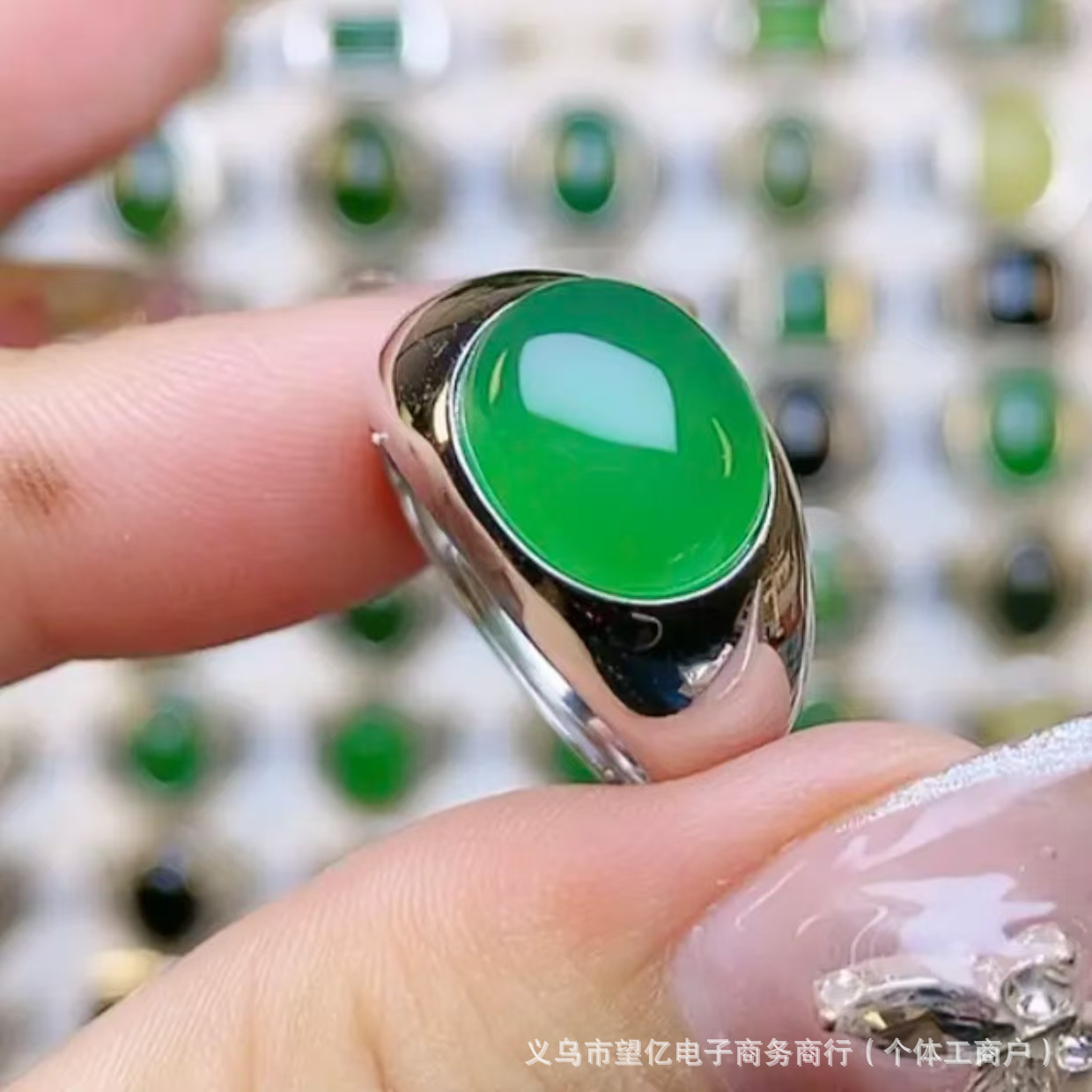 Retro Domineering Fashion Imitation Natural Agate Silver-Plated Inlaid Emerald Men's Index Finger Ring Live Ring Wholesale
