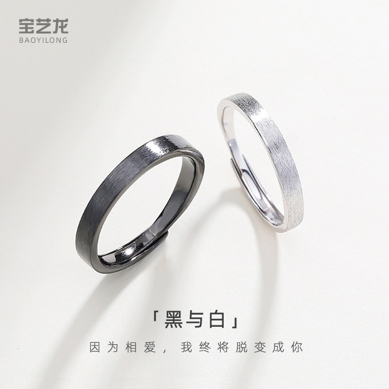 Black and White Ring S925 Sterling Silver Couple Ring for Women and Men a Pair of Simple High-end Plain Ring Opening Ring Jewelry