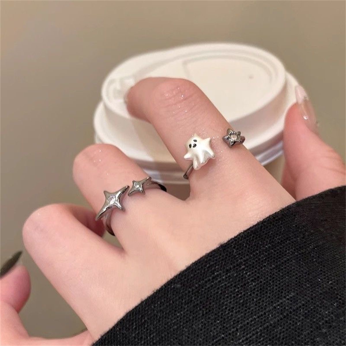 Sweet and Cool Four-Pointed Star Little Ghost Ring for Women and Men, Unique Niche Index Finger Ring, Cute Stylish, Creative Open Ring