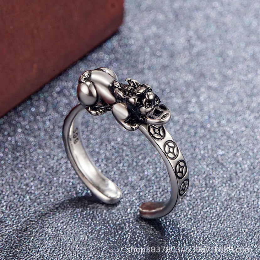 National Trend Domineering Retro Plain Silver Beast Ring Men's Thai Silver Pixiu Alloy Live Mouth Ring Men's Open Ring