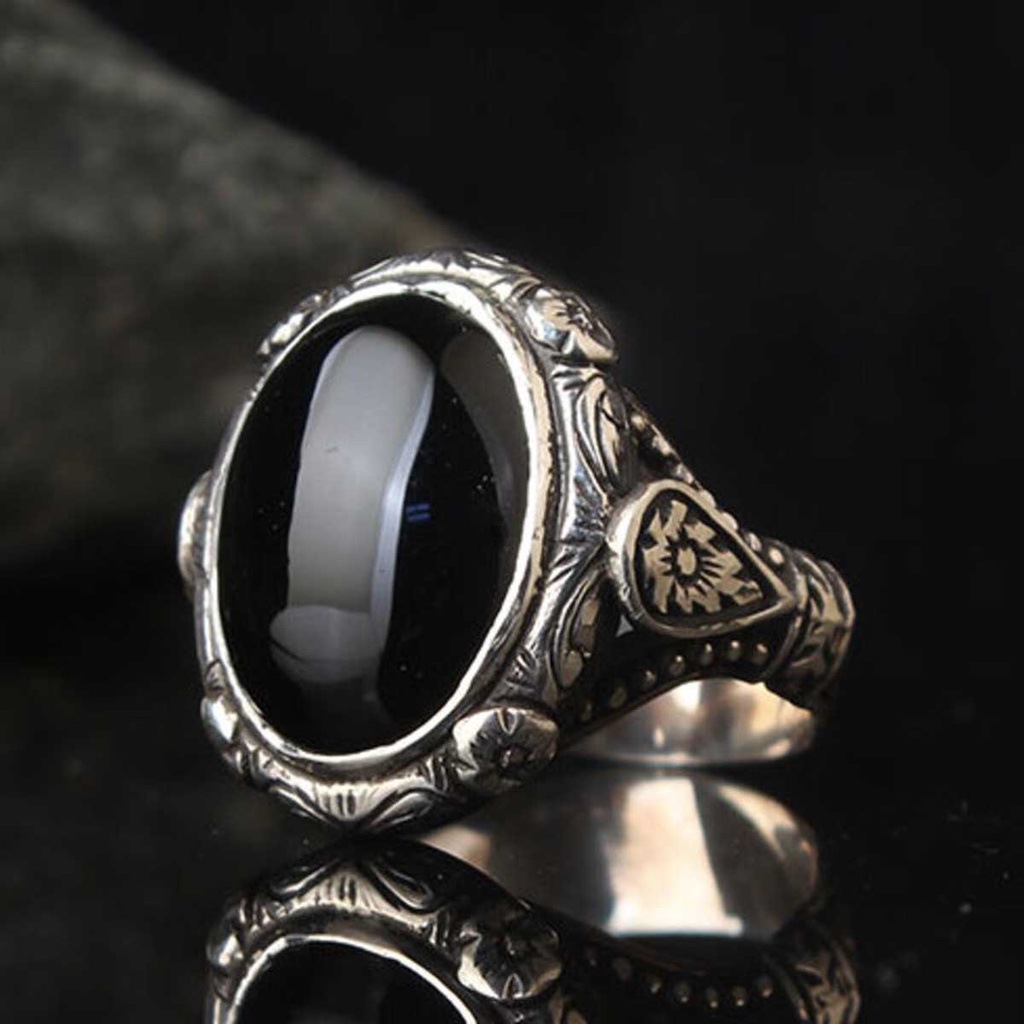 Qiyu cross-border retro domineering mechanical texture egg-shaped black agate men's fashion bracelet silver ring ring