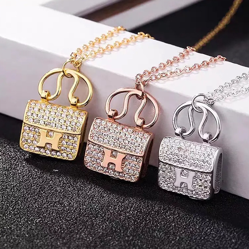 2022 New H Letter Bag Necklace Women's Full Diamond Rose Gold Clavicle Chain Silver Fashionable Distinctive Earrings Internet Popular