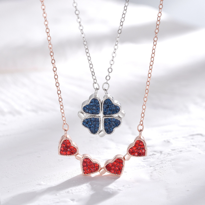 S925 Silver Red, Blue, Pink, White, Red, Black Pendant Four-Leaf Clover Necklace, One Piece with Multiple Sides, Double-Sided Heart, Tiktok Style Collarbone Necklace