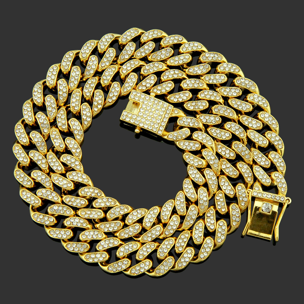 European and American hip hop alloy full diamond domineering hipster Cuban chain necklace men's Hip Hop disco dancing Personality Diamond-embedded accessories