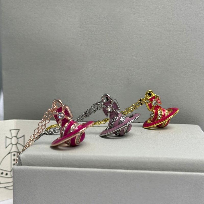New Xijia Orb Stereo Spiral Full Diamond Planet Pink Enamel Necklace Women's Accessible Luxury High-End Sweater Chain