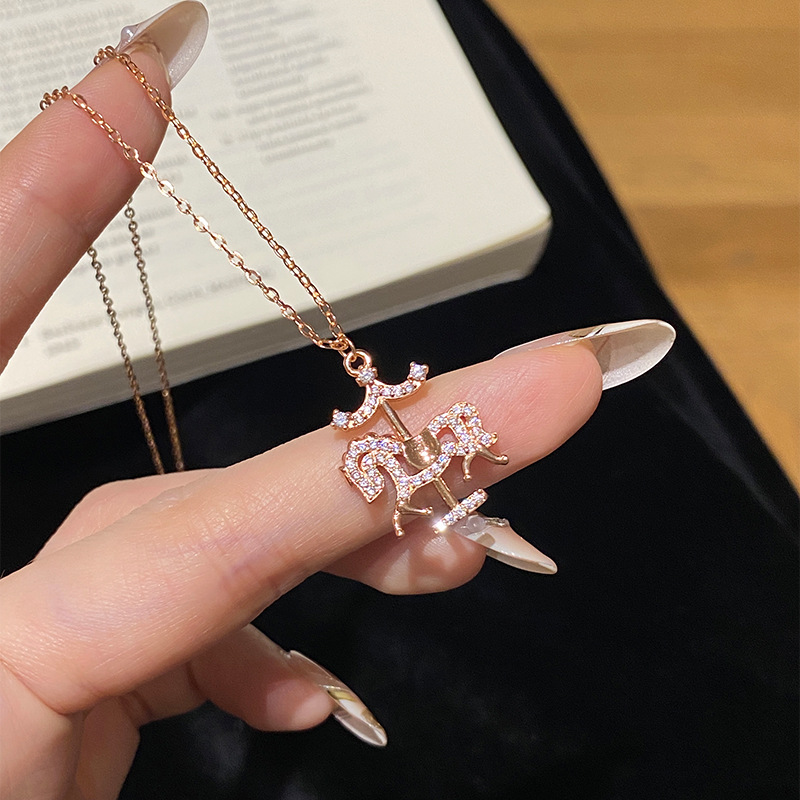 Tich Real Shot S925 Sterling Silver Carousel Necklace for Women, Light Luxury Niche Design Full Diamond Year of the Horse Clavicle Chain Trend