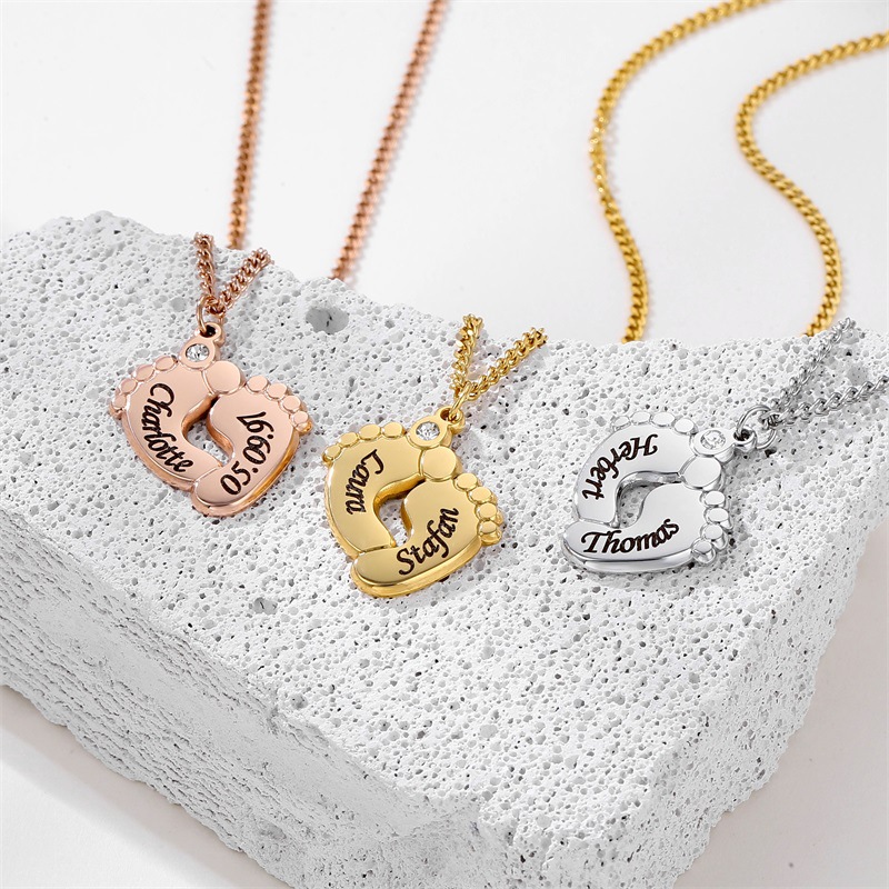 Cross-border Hot Selling Stainless Steel Laser Engraving Baby Name Necklace Pendant Personalized Diamond Foot Jewelry