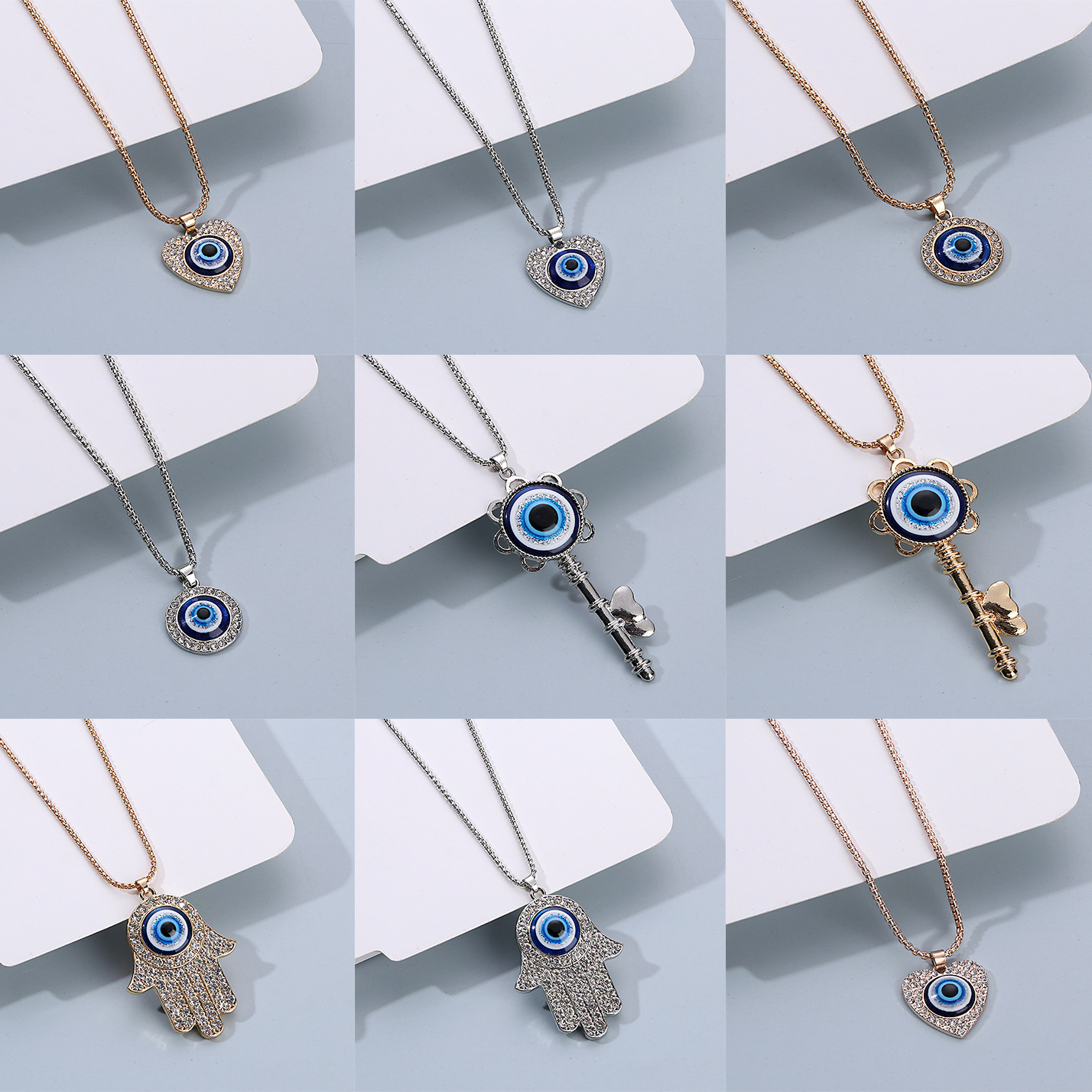 European and American Retro Fatima Hand Peach Heart Round Key Alloy Pendant Full Diamond Necklace Devil's Eye Necklace