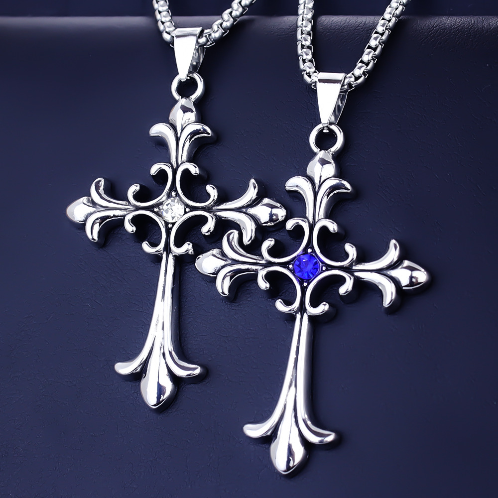 Gothic Style Retro Cross with Diamonds, Titanium Steel Blue Diamond and White Diamond Pendant, European and American Style Trendy Wear Stainless Steel Necklace