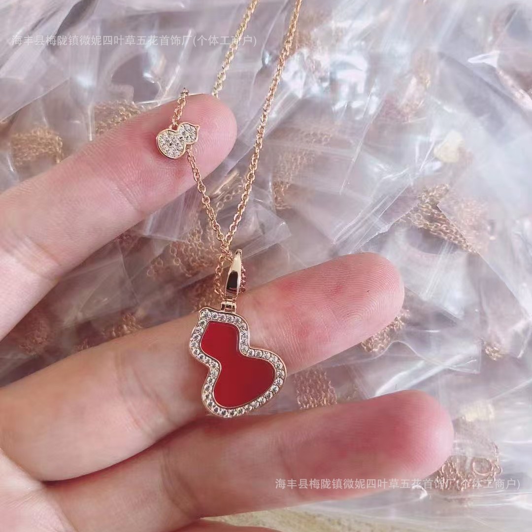High-End Gold-Plated Gourd Necklace with Thick 18K Rose Gold Plating, Natural Red Agate and White Mother-Of-Pearl Pendant with Diamond-Encrusted Double Gourd