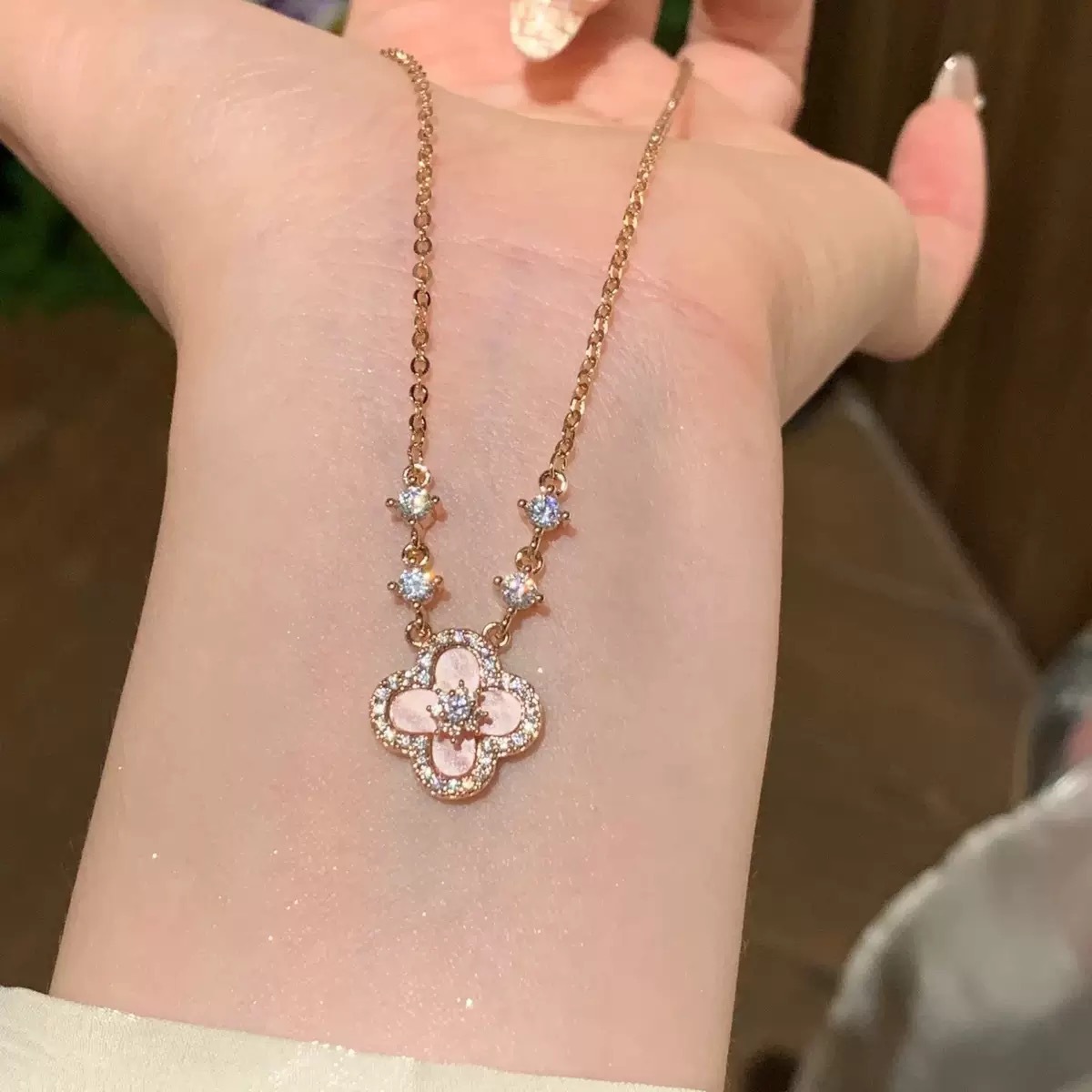 New Full Diamond Pink Shell Four-Leaf Clover Necklace Women's Fashion Light Luxury High-End Niche Design Clavicle Chain