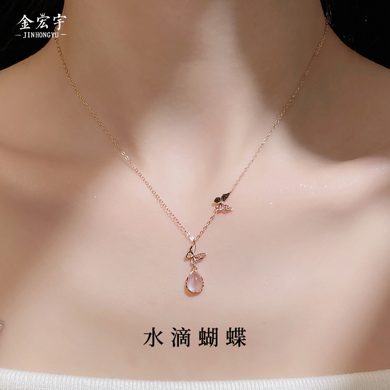 925 Sterling Silver Water Drop Butterfly Necklace Women's Korean Style Ins Chanel Style Hibiscus Stone Clavicle Chain High-grade Mori Style Pendant