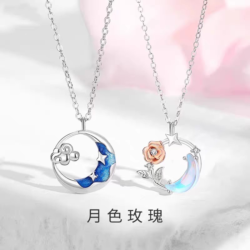 Moonlight Rose couple necklace a pair of niche fresh Moonstone pendant fashion gold flower moon clavicle chain