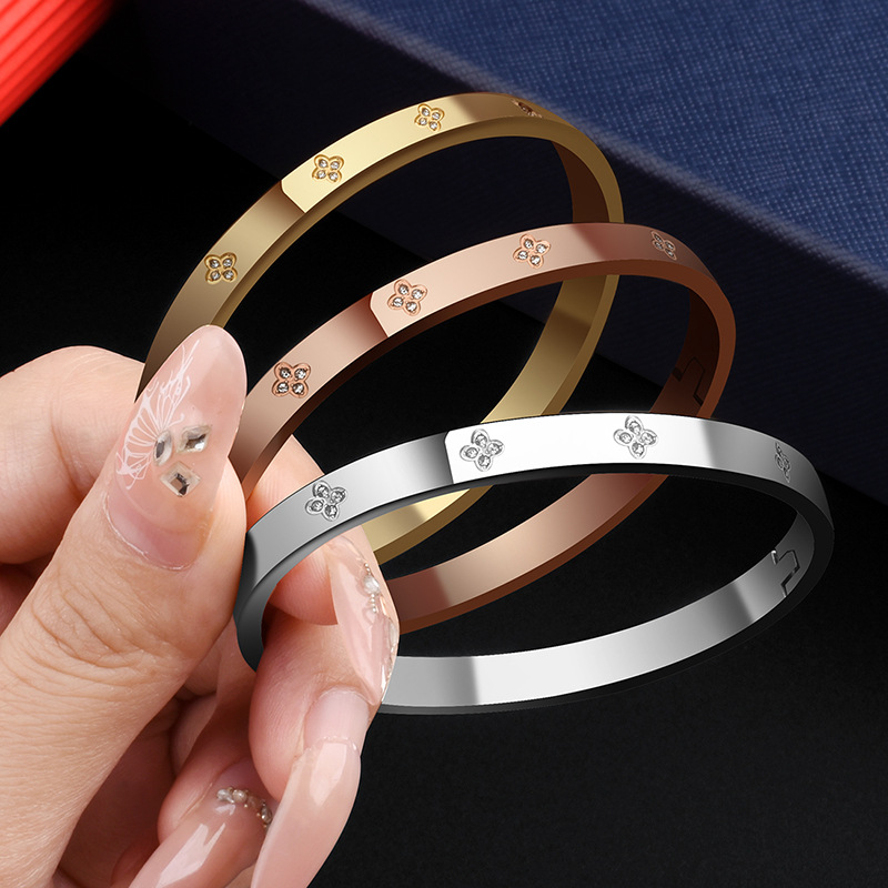 European and American Cross-border Four-leaf Clover Shiny Diamond-encrusted Titanium Steel Bracelet for Women Couple Trendy Light Luxury No Falling Fashion plain Circle Bracelet