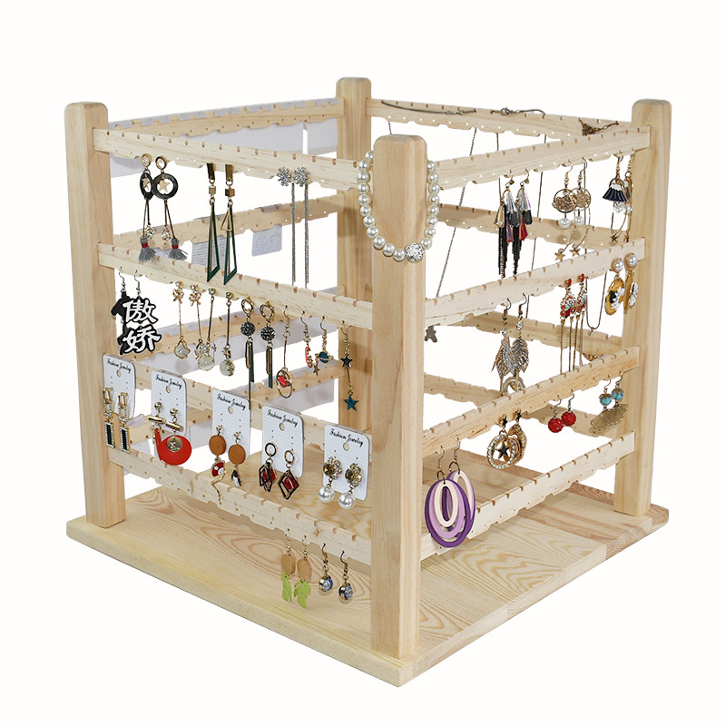 Solid Wood Four-sided Rotating Earring Rack Earrings Jewelry Display Stand Earrings Necklace Bracelet Large Capacity Stall Jewelry Rack