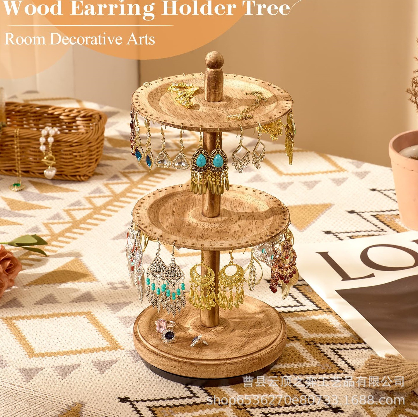 Wooden Jewelry Rack Iron Multi-Layer Rotatable Earrings Necklace Bracelet Hanger Solid Wood Jewelry Display Rack