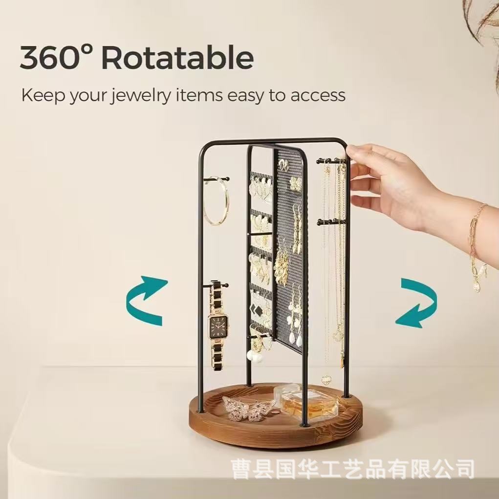 Wooden Jewelry Rack Iron Multi-Layer Rotatable Earrings Necklace Bracelet Hanger Solid Wood Jewelry Display Rack