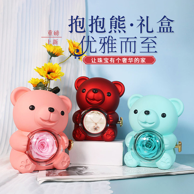 New Tanabata Valentine's Day Hugging Bear Rotating Eternal Flower Gift Box Ring Necklace Jewelry Box Packaging Box Jewelry Box