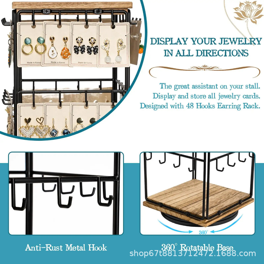 Iron and Wood Combined Desktop Rotating Small Jewelry Storage Rack Solid Wood Earrings and Rings Multi-purpose Storage Rack Rotating