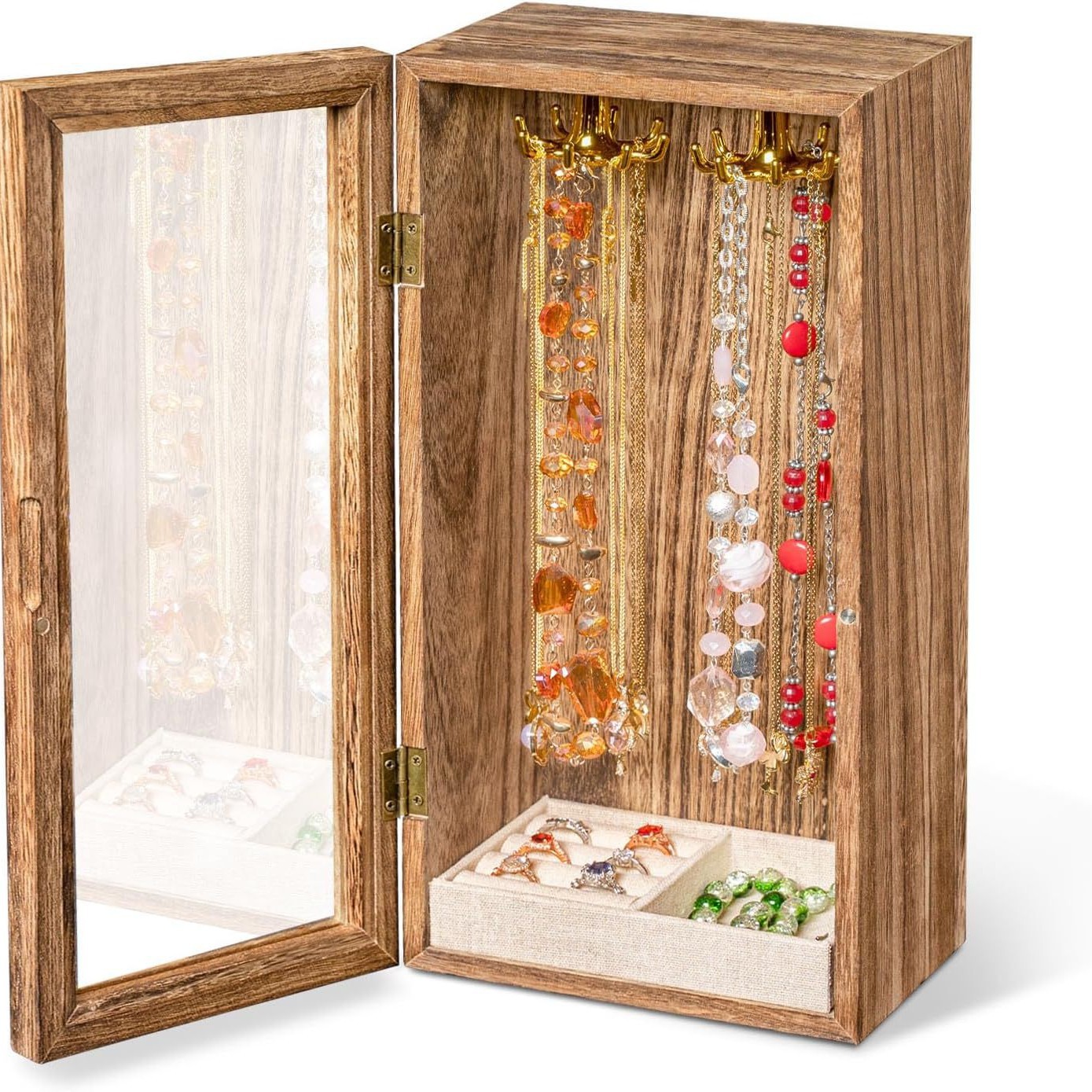 Necklace Storage Rack Wooden Necklace Organizer with Ring Tray Rotatable Necklace Box Display Jewelry Organizer