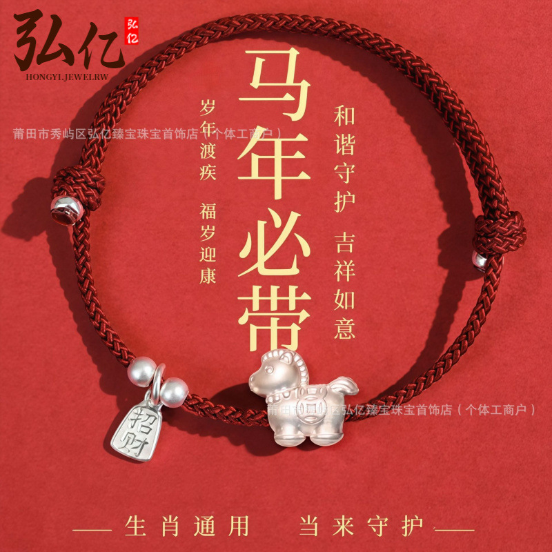 Pure Silver 999 Year of the Horse Silver Horse Fortune Red Rope Bracelet Women's Zodiac Year Auspicious Wear Red Rope Sterling Silver Gift