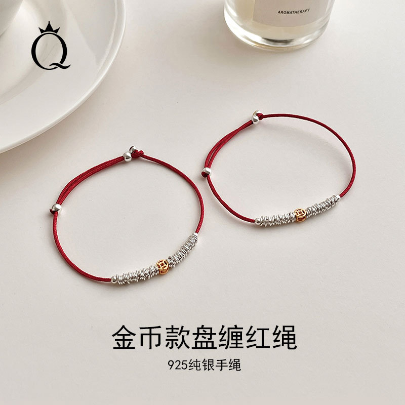 Solid silver tuo s999 sterling silver peace joy money string winding bracelet this life year red rope valentine's day gift