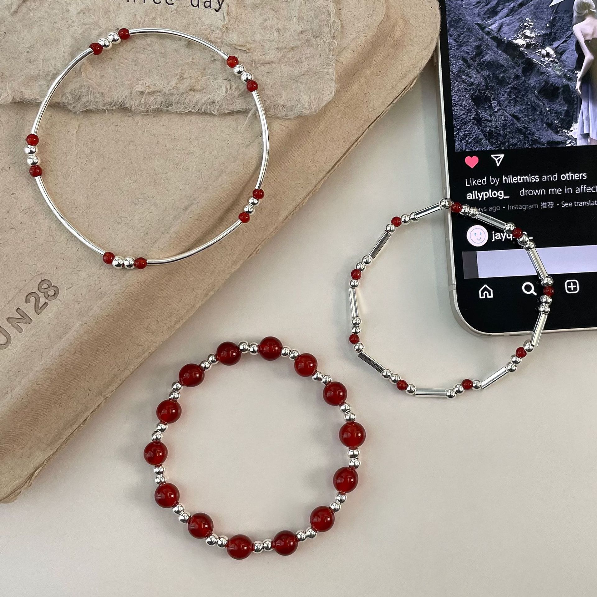 S925 sterling silver silver beads red agate bracelet light luxury high-end ins simple versatile fashion style niche design
