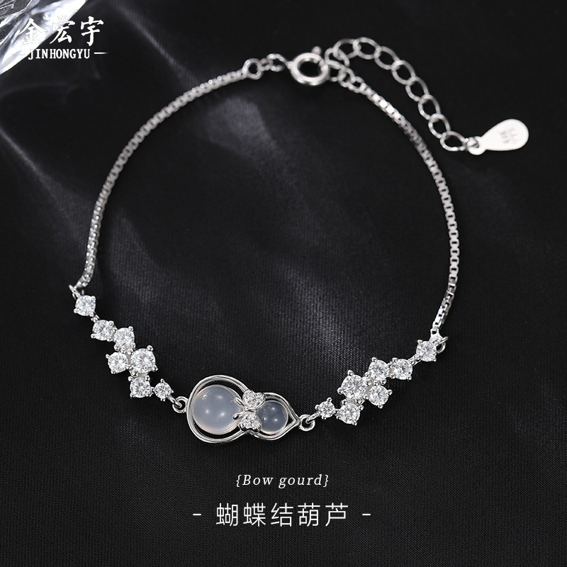999 Sterling Silver New Chinese Style Bow Gourd Bracelet Women's Ins Niche Light Luxury White Chalcedony Bracelet Girl's Heart Bracelet