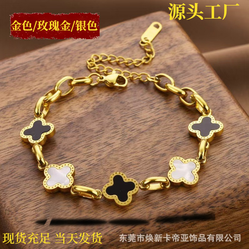 Europe and the United States cross-border 18k titanium steel four-leaf clover black and white shell bracelet Korean Bohemian temperament titanium steel non-fading chain