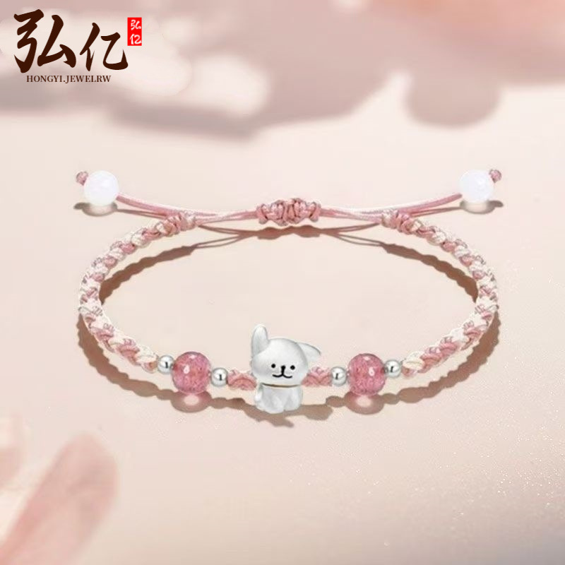 Pure Silver 999 Chinese Style Couple Bracelet Sterling Silver Zodiac Line Puppy Braided Rope Strawberry Crystal Bracelet Female Gift