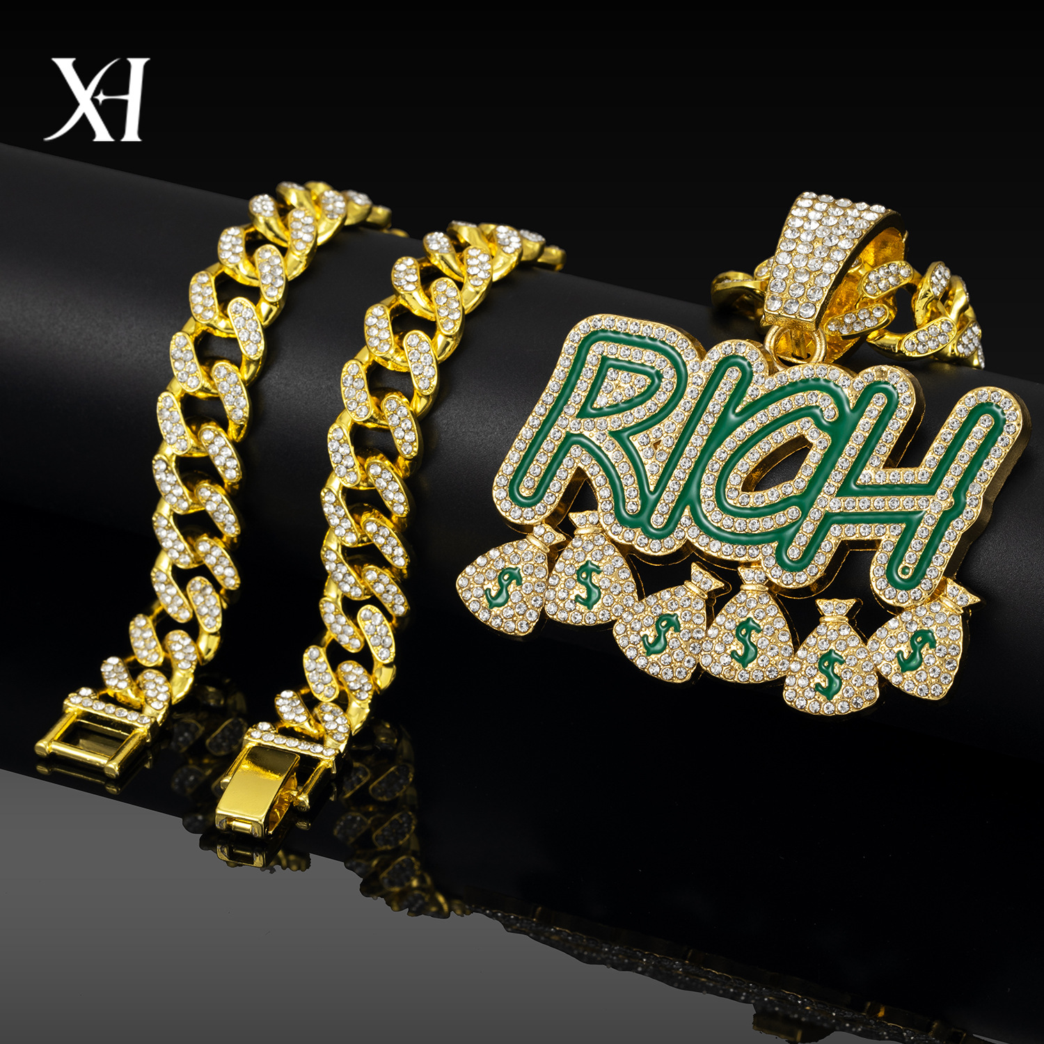 Miami European and American RICH Letter Diamond-encrusted Hip-hop Cuban Necklace Men's Long Hip-hop Trendy Jewelry Wholesale