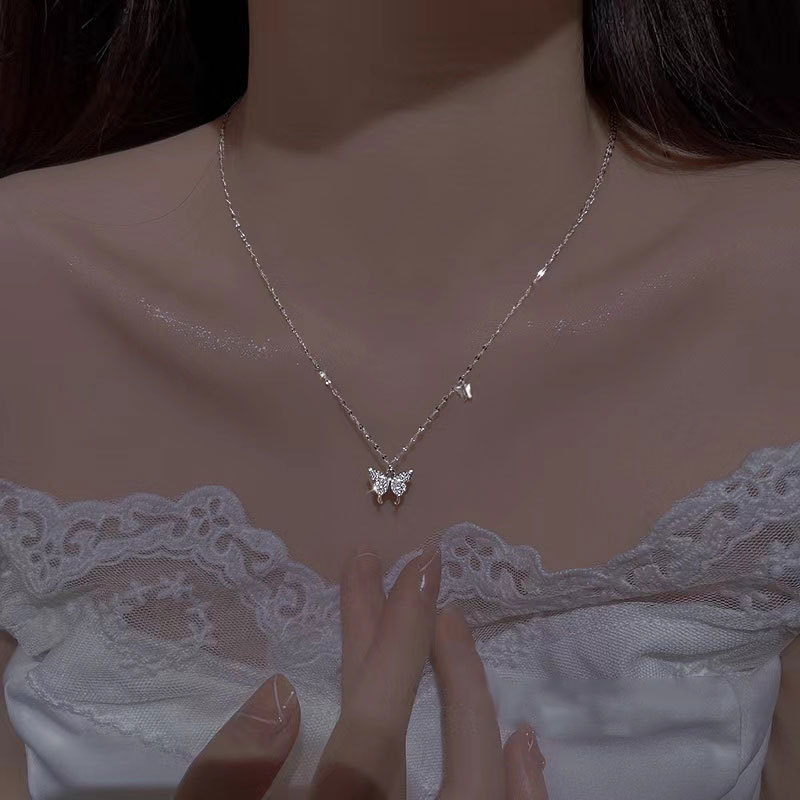 Square S925 Sterling Silver Butterfly Necklace Autumn and Winter Light Luxury High-end Sense New Niche Design Pendant Explosive Clavicle Chain
